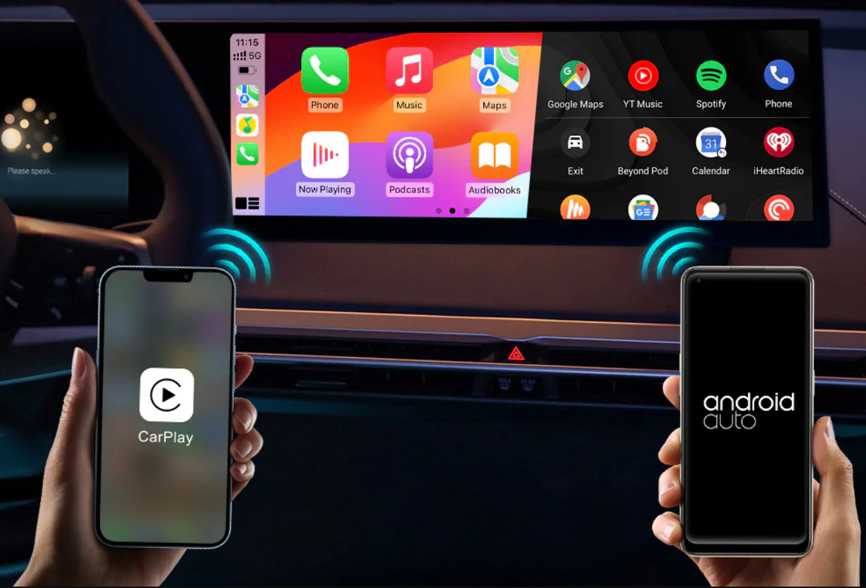 O Carlinkit 4.0 traz uma evolução importante: o suporte simultâneo a CarPlay sem fio e Android Auto sem fio.